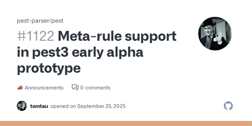 arrow-up11arrow-down1external-linkMeta-rule support in pest3 early alpha prototypeplus-squaregithub.comtomtau@aussie.zone · 4 months agomessage-square0linkfedilink