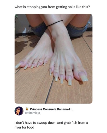 I’ve seen a few people with talons like this in Florida but most places it’s not practical or socially acceptable to wear flip flops for all occasions and year round. You’re not getting those things in normal shoes.