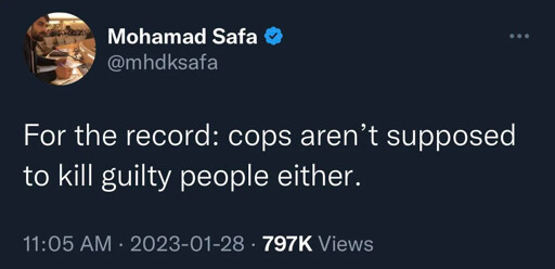 No no, don’t you see, the act of the killing is how they identify people as guilty. It’s like wave function collapse in quantum physics — or “Schrödinger’s criminal” to put a pithy spin on it. Because the police only kill bad people who deserve to die, then anyone who is alive could be good or bad, but we don’t know for certain until the police kill them. If the police accidentally shot at a non-criminal, then they’d be fine — the non criminal body has ways of shutting that whole thing down
