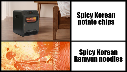 Maybe I just havent had the right ones. I’ve had spicy ramyeon, but not the kind that makes me regret my life or just cause pain on my tongue. I HAVE had that pain in the form of max level (5) Indian food and jollof rice, however. Well, I can eat level 5 Indian food without dying, but at that point I’m not enjoying/tasting the flavor as much as I’m just tasting tingles, so I just get level 4 as a haply middle ground.