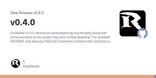 CtrlAssist v0.4.0 introduces demultiplexing functionality along with enhancements to the system tray and rumble targeting. The updated README now features FAQ and Cookbook sections with practical examples, such as the “Double Agent Tag Team” scenario, where a single assist controller uses a demux to help multiple primary players across separate mux instances, and the “Couch Co-Op Swap” scenario, in which two players take turns assisting each other using toggle mode, with force feedback following the currently active controller by default.