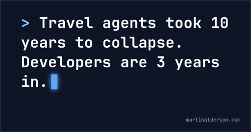 arrow-up124arrow-down1external-linkTravel agents took 10 years to collapse. Developers are 3 years inmartinalderson.comRSS Bot@lemmy.bestiver.seMB to Hacker News@lemmy.bestiver.seEnglish · 19 days agomessage-square23linkfedilinkfile-text
