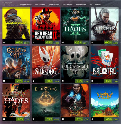 mr_MADAFAKA@lemmy.ml to Steam Hardware@sopuli.xyz · 19 days agoMost Played Games on Steam Deck for 2025lemmy.mlimagemessage-square76linkfedilinkarrow-up1348arrow-down12file-text