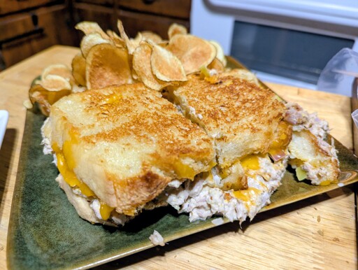 find most people don’t put enough acid in their tuna mix to balance the grilled bread, cheese, tuna and mayo. So I add the relish and also mince up pepperonis to balance everything.